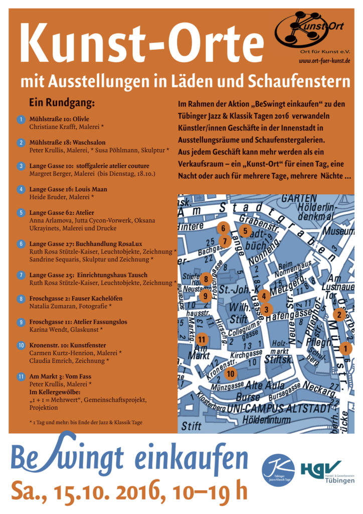 Künstlerinnen und Künstler vom Verein Ort für Kunst e.V. haben die Aktion initiiert und organisiert: Während der Jazz und Klassik Tage präsentieren überwiegend lokale Künstler ihre Kunst in verschiedenen Ladengeschäften und Schaufenstern in der Tübinger Innenstadt und bringen so Kunst und Publikum an neuen Orten zueinander. Programm/Plakat