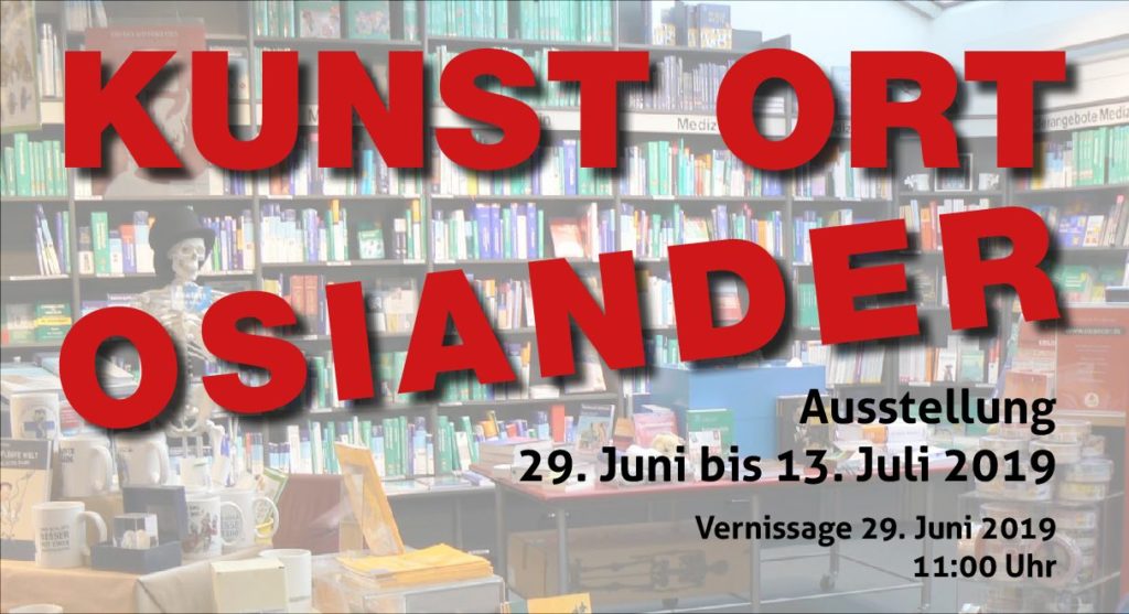 EINLADUNG ZUR AUSSTELLUNG KUNST ORT OSIANDER 29. Juni 2019 bis 13. Juli 2019 Mit der „Kunst-Ort“ Aktion will der Verein „Ort für Kunst e.V.“ Leerstände und Ladengeschäfte – bevorzugt in der Tübinger Innenstadt – kreativ (mit-)nutzen und durch Kunst beleben. Freundlicherweise stellt die Buchhandlung Osiander ihren leerstehenden Verkaufsraum im Obergeschoss des Standorts Wilhelmstraße 12 in Tübingen dem Verein für eine Ausstellung zur Verfügung. 18 Künstlerinnen und Künstler zeigen in der Originaleinrichtung der Buchhandlung Gemälde, Skulpturen und Installationen. Selbst der Brunnen in der Mitte des Verkaufsraumes dient noch einmal einer Wasserinstallation.…