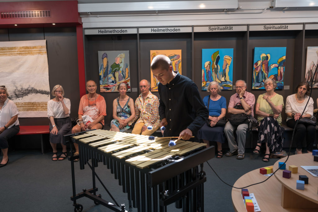 Vom 29. Juni bis 20. Juli war die Buchhandlung Osiander „Kunst-Ort“. In dem leerstehenden Verkaufsraum im Obergeschoss des Standorts Wilhelmstraße 12 zeigten 17 Künstlerinnen und Künstler in der Originaleinrichtung der Buchhandlung Gemälde, Skulpturen und Installationen. Zur Vernissage verwandelte der Vibraphonist Jann-Matti Pallas den Kunst-Ort in eine wunderbare Klangwelt (Foto oben). Caroline Minner, Abteilungsleitung des Fachbereiches Kreativität der VHS Tübingen, führte in die Ausstellung ein. Die von Kristina Regele Holder und Kirstin Hasper-Zietlow organisierte Gemeinschaftsausstellung fand ein zahlreiches und interessiertes Publikum. „Vielfalt in Harmonie gebracht“, „Sehr schöne Ausstellung an einem schönen…