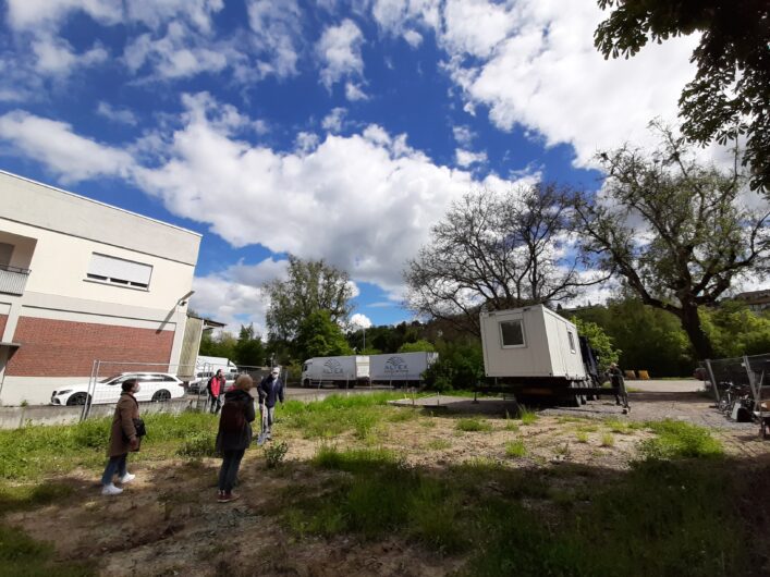 Am Donnerstag, 20.05., schwebte er endlich ein: Der erste gebrauchte Bürocontainer wurde im Schleifmühleweg 84 angeliefert und per Kran aufgestellt! Der Anfang für den „Kunst-Container“, eine mobile Atelier-und Werkstatteinheit, ist gemacht! Zusammen mit der Initiative Lebenskunst (V.i.Gr.), die zwei Bauwägen mit Ateliereinrichtungen aufstellt, richtet Ort für Kunst e.V. auf der Freifläche beim ehemaligen Zentrum Zoo ein kulturelles Experimentierfeld für den Stadtteil ein. Die mobilen Atelierräume stehen für künstlerische Arbeit, für Workshops und offene Angebote zur Verfügung. Mit den Projektinitiator*innen waren einige interessierte Projektbegleiter/ Kooperationspartner*innen aus dem Stadtteil und Kulturbereich vor Ort …