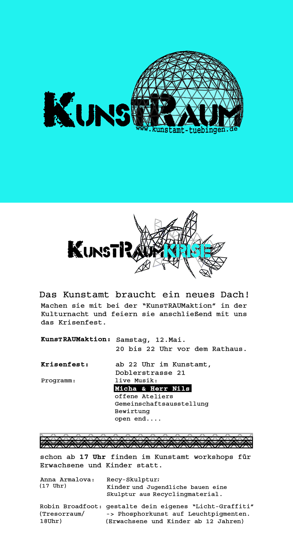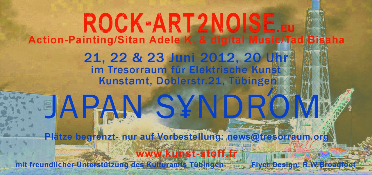 ![]() Download Flyer: Vorderseite [JPG ~ 338 KB] Rückseite [JPG ~ 448 KB] ... ZIRKAZIRKA im Tresorraum Kunstamt Tübingen Doblerstrasse 21 ![]() Die Gruppe ZIRKAZIRKA bezieht vom 15. bis zum 18. April 2013 den Tresorraum im Tübinger Kunstamt. Dieser Raum ist in seiner Bauweise ein sehr besonderer Ort für ein Music-Performance-Projekt. Optisch, da er verliesähnlich, ohne Fenster und weitere Zugänge nach draußen, außer der Tür, gemäß seiner früheren Bestimmung, sehr hermetisch konzipiert ist. Akkustisch, da Dank einer speziellen Bauweise darin Klangphänomene entstehen, die diesen Raum einzigartig machen. ZIRKAZIRKA wird seine eigenen Vorgehensweisen mit den Bedingungen dieses Raumwürfels abstimmen müssen und Neue entdecken. In diesen 14 Tagen wird die Gruppe ZIRKAZIRKA einerseits ohne Öffentlichkeit im Tresorraum arbeiten, anderseits teilweise öffentlich, zudem stehen Auftrittstermine fest. Es wird Tage geben, an denen Erforschungsarbeit auf dem Plan steht, wobei eine kleine Anzahl Besucher gerne willkommen sein wird. Diese Angebote sind kurzfristig den Foren von ZIRKAZIRKA zu entnehmen. Vorherige Absprache wird dafür von ZIRKAZIRKA erbeten. Adressen für Information und Kontaktaufnahme: 1.facebook: Ulrike Helmholz 2.facebook: Ralf Meinz 3. www.ulrikehelmholz.com 4. www.zirkazirka.com 5.info@zirkazirka.com Feste Auftrittstermine: So, 21.04.2013 von 16:30 Uhr bis 20:30 Uhr im Rahmen: „Tag der offenen Ateliers“ Kunstamt Tübingen „Work In Progress“, einzelne Sets; die Gruppenmitglieder stehen für Gespräche zur Verfügung. Vorpremiere: Fr, 26.04.2013 ab 20:30 Uhr Premiere: Sa, 27.04.2013 ab 20:30 Uhr Weitere Informationen: Infotext [PDF ~ 8 KB] http://www.zirkazirka.com __ 2012 JADE_DEKONSTRUKTION _ Elektronische Musik im Kunstamt_Tresorraum Freitag, 19. Oktober 2012, 21 Uhr im Rahmen der Tübinger Jazz- und Klassiktage 2012 JUNYA OIKAWA: TOKIO, LAPTOP THOMAS MAOS: TÜBINGEN, GITARREN, ELEKTRONIK SERGE LE GOFF: PARIS, LICHT-RAUM-GESTALTUNG Der Tübinger Experimentalmusiker Thomas Maos hat Junya Oikawa bei der Stipendiumsvergabe 2012 der Kunststiftung Baden-Württemberg kennengelernt und ihn gleich für das diesjährige Camp-Festival in Stuttgart und die Jazz & Klassik Tage engagiert. Junya Oikawa gehört zur jüngsten Generation japanischer Avantgardemusiker. Der Klangkünstler nimmt Klänge aus dem Alltag auf und transformiert sie mit dem Laptop in einzigartige Klangbilder - kompromisslos, minimalistisch und intensiv. Er hat an der Universität in Tokio Klangdesign studiert und arbeitet derzeit am ZKM in Karlsruhe. Thomas Maos, ebenfalls Stipendiat der Kunststiftung, gehört zu den Gitarristen, die die seltene Kunst beherrschen, eine Gitarre nicht nach einer Gitarre klingen zu lassen. Beide Musiker haben bereits auf dem Camp-Festival zusammengearbeitet und ihre gemeinsame Leidenschaft für Soundscapes entdeckt. Das Duo JADE_DEKONSTRUKTION entwirft langsam sich verdichtende und wieder auflösende Klangbäder, wie ein elektronisches Atmen. Für das Konzert wird der Künstler Serge Le Goff den Tresorraum ausstatten und illuminieren. Tübinger Tresorraum für Elektrische Kunst KUNSTAMT TÜBINGEN Doblerstraße 21 EINTRITT: 15,- Euro, ermäßigt 10,- Euro Weitere Informationen unter: http://www.junya-oikawa.com [http://de.wikipedia.org/wiki/Thomas_Maos][http://www.zenapolae.com/?q=zen049] http://www.kunst-stoff.fr/tresorraum/ ... Sonderausstellung im Kunstamt 16.09.2012 - 1.10.2012 Der Tübinger Künstler Michael Berttram präsentiert in seiner neuesten Ausstellung seine misslungensten und schlechtesten Gemälde und Zeichnungen. Normalerweise verschwinden solche Werke unbeachtet in Archiven, hier wird nun zum ersten Mal auch die peinliche Seite des Kunstschaffens gezeigt. Die Ausstellung wird so zur Auseinandersetzung mit den Begriffen "gut / schlecht" und hinterfragt die Objektivität von Geschmacksurteilen. Die Bilder werden im Kunstamt Doblerstr. 12, Tübingen gezeigt. Öffnungszeiten sind täglich, jeweils von 9.00 Uhr bis 12.00 Uhr (bitte klingeln) ... Deutsch-ukrainischer Künstleraustausch Das "Kulturtschuk"- Projekt, ein deutsch-ukrainischer Künstleraustausch, initiiert von einer Gruppe von Künstlern im Tübinger "Kunstamt", geht in eine zweite Runde: nach dem Besuch einer Delegation von Kunstamt-Künstlern in der ukrainischen Stadt Krementschuk sind diesen Sommer ukrainische Künstler aus Krementschuk und Kiew im Kunstamt zu Gast. Aus diesem Anlass veranstaltet die Initiative in Kooperation mit der West Ost Gesellschaft Tübingen und unterstützt von der Kreissparkasse die vom 13.07. bis 21.07.2012 die Deutsch-Ukrainischen Kulturtage in Tübingen. Die Kulturtage starten mit der Vernissage der Ausstellung ukrainischer Künstler in der "do21 - Galerie im Kunstamt", Doblerstrasse 21, am Freitag, den 13.07.2012, um 18 Uhr. Die ausstellende Künstler Aleksander Cherepanov (Grafiken, Aquarelle zu aktuellen Themen), Viktor Daysun (abstrakte Malerei), Valentina Kramarenko (Fotografien) sind bei der Vernissage anwesend. Zu der Ausstellungseröffnung mit musikalischem Begleitprogramm laden wir Sie herzlich ein. Weiteres Programm der Kulturtage: 13.07. Besichtigung der Staatsgalerie in Stuttgart 14.07. Ein Sommer-Musik-Abend auf der Kunstamt-Terrasse 15.07. Gemeinsamer Sommerfest mit West-Ost-Gesellschaft 16.07. Reise zum Bodensee, Besuch bei Christel Lehmann 17.07. Workshop „ Altstadt Tübingen“ und Besichtigung der Kunstateliers 18.07. Besichtigung des Zeicheninstituts der Universität Tübingen 20.07. Malworkshop am Neckar mit den Schülern der Kunst- und Kulturwerkstatt Tübingen 21.07. Finissage der Ausstellung und Abschieds-Abend Öffnungszeiten sind Do, Fr, Sa 14 bis 19 Uhr und gerne auch nach Vereinbarung. Kontaktperson: Anna Arlamova, Anna.Arlamova@web.de oder Tel. (07071) 65963. Einladung [PDF ~ 145 KB] ... Tresorraum für Elektrische Kunst JAPAN S¥NDR'OM Action-Painting / Sitan Adèle K und Digital Music / Tad Bisaha 21., 22. oder 23. Juni 2012, 20 Uhr (D