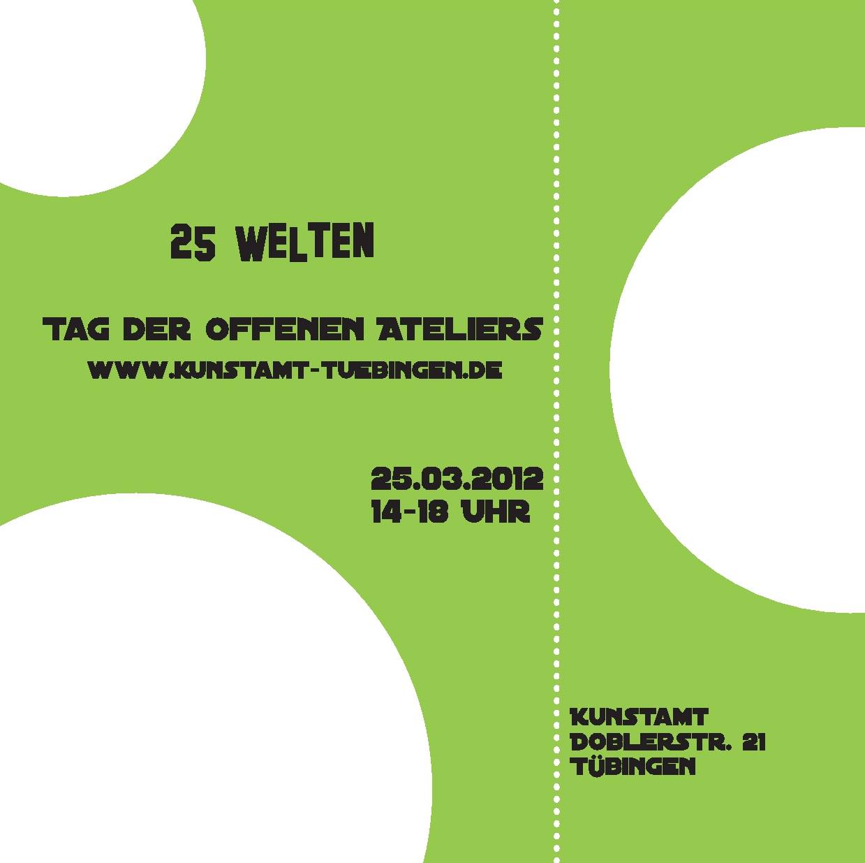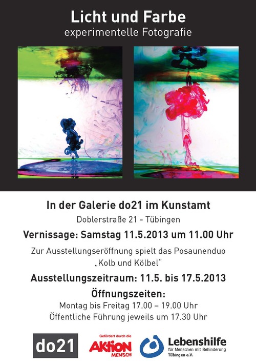 ... 13. Mai 2013 "Erste Intermezzo-Galerie erfolgreich gestartet." Weitere Informationen im Kunstamt-Blog unter: http://kunstamt-tuebingen.tumblr.com/post/50304771321/erste-intermezzo-galerie-erfolgreich-gestartet ... 8. Mai 2013 "Neue Ausstellung: Malerei und Grafik von Elena Suleymanova" 12. bis 31. Mai 2013 Eröffnung am Sonntag, 12. Mai 2013 um 14.00 Uhr im 1. Stock des Kunstamts Öffnungszeiten: Do, Fr 16.00 - 19.00 Uhr, Sa 14.00 - 17.00 Uhr und nach Vereinbarung Kontakt und weitere Informationen im Kunstamt-Blog unter: http://kunstamt-tuebingen.tumblr.com/post/49954306145/neue-ausstellung-malerei-und-grafik-von-elena ... Fotoausstellung "Licht und Farbe" Am Samstag, den 11. Mai 2013 um 11.00 Uhr eröffnet in der Galerie do21 im Kunstamt (Doblerstr. 21, Tübingen) die Fotoausstellung “Licht und Farbe”. Gezeigt werden Portrait- und experimentelle Farbfotografie von Menschen mit und ohne Behinderung. Entstanden sind die spannenden fotografischen Arbeiten während eines durch die Aktion Mensch geförderten Fotoworkshops, der im Rahmen des Projekts “Tübingen - Kultur Inklusiv” in Kooperation von Lebenshilfe Tübingen e.V. und Kunstamt durchgeführt wurde. Angeleitet wurden die Workshopteilnehmer/innen vom Tübinger Fotografen Andreas Karge, der ein Atelier im Kunstamt betreibt. Zur Eröffnung spielt das Posaunenduo “Kolb und Kölbel”. Ausstellungszeitraum 11. - 17. Mai 2013 Öffnungszeiten: Montag - Freitag 17 - 19 Uhr Öffentliche Führung jeweils um 17.30 Uhr ![]() Download Einladung: [JPG ~ 98,2 KB] ... "Eine Kunst wäscht die andere" - Tag der offenen Ateliers und Ausstellung "Wechsel-Wirkungen"- im Kunstamt Tübingen, 21. April 2013, 14 - 18 Uhr Im Kunstamt, der sich ein weiteres Jahr fortsetzenden Zwischennutzung des ehemaligen Jugendamts als "Atelierhaus auf Zeit" treffen ganz unterschiedliche Künstler und Kunstrichtungen aufeinander. Donald Duck meets Mona Lisa oder: was geschieht eigentlich mit der Kunst, wenn Comiczeichner und klassische Aquarellmalerin aufeinandertreffen, abstrakte Kunst Tür an Tür mit gegenständlichem Schaffen entsteht, der Porträtfotograf oder die Videokünstlerin sich den Flur mit Bildhauern oder Tonskulpturenkünstler teilen, die arrivierte Künstlerin und der Künstler-Nachwuchs über ihre neuesten Werke ins Gespräch kommen....!? Spiegelt sich der - teils schon jahrelange - Austausch über Genre-und Generationengrenzen hinweg in den Werken wieder? „Wäscht“ eine Kunst die andere? Mit einem Tag der offenen Ateliers am 21. April laden die Künstler ein, mit ihnen zusammen diesen Fragen zur Wechsel-Wirkung in der Kunst nachzugehen - bei einem Gang durch die 25 Ateliers und in der eigens für diesen Termin geschaffenen Ausstellung künstlerische Wechsel-Wirkungen zu entdecken, Kunstbeziehungen der Künstler und ihrer Werke aufzuspüren. Im Begleitprogramm spielt das Akkordeonorchester an der Universität, Ulrike Helmholz, Ralf Meinz und Bertil Rehmann (siehe Info zu ZIRKAZIRKA im Anschluss) bieten Musik und Performance im Tresorraum. Zwei Workshops werden angeboten – Robin Broadfoot lädt zum Lichtobjektebauen in die Garage, Anna Arlamova und Jutta Cycon-Vorwerk zur „Kunstwäsche“ in ihr Atelier. Nähere Infos zum Programm auch im Flyer: