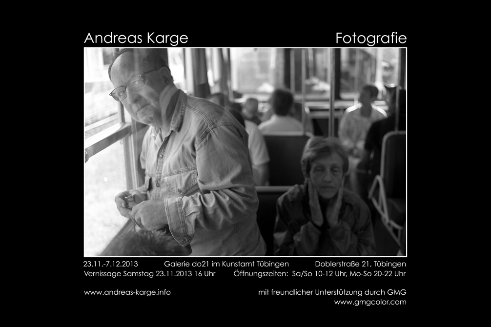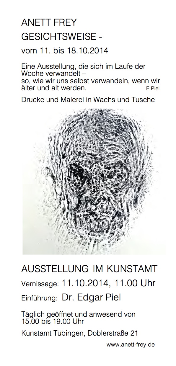 Die digitalen "Weltbilder", die bei der Veranstaltung entstehen, werden an Ort und Stelle gezeigt. ![]() Bild: Viki Semou, Framing Einladung zum Tag der offenen Ateliers am 23.03.2014 mit Programm zum Download: oben: [JPG ~ 138 KB] unten: [JPG ~ 87 KB] en: [JPG ~ 1 ![]() ![]() __ 2013 Andreas Karge FOTOGRAFIE Galerie Do 21, Kunstamt Tübingen, Doblerstrasse 21 Ausstellung einer Auswahl an Bildern des Fotografen Andreas Karge. Vernissage: 23.11.2013 um 16 Uhr Zeitraum: 23.11. - 15.12.2013 (verlängert) Öffnungszeiten: Sa/So 14-17 Uhr Mi/Frei 18-20 Uhr und nach Absprache Kontakt: Andreas Karge 0173/2849514 Bildauswahl ausgehend von den 1980iger Jahren, in denen Karge als Berufsfotograf in Halle arbeitete, bis hin zu aktuellen Bildern, wobei er die Fotografie nunmehr aus Leidenschaft betreibt und ein Atelier im Kunstamt Tübingen hat. Die Auswahl der Bilder spiegelt sein Interesse an Menschen in ihrer Umwelt wieder, aber auch an abstraktem Zeichnen mit Licht, was ihn ebenso fasziniert. Zu sehen ist die Ausstellung im Rahmen der do21 Ausstellungsreihe des Kunstamtes Tübingen, in der Doblerstraße 21. Die Vernissage findet am 23. November 2013 um 16.00 statt. Begleitet wird diese durch den Akkordeonisten Norbert Bremes. In den 14 Tagen der Ausstellung ist Andreas Karge auch zu den Öffnungszeiten anwesend und offen für Führungen und Fragen. ![]() Einladung: [JPG ~ 199 KB] Weitere Informationen unter http://andreas-karge.info ... Workshop: "GESTALTEN MIT LICHT" Robin Broadfoot (Phosphor-Graffiti) Gregor Schultes (Licht Malerei) Esteban Portal (Grafik-Generator) 23.11.2013, 17h - 22 Uhr, Eintritt frei Tresorraum, Kunstamt, Doblerstr.21 Alle (ab 12 Jahre) sind eingeladen mit Licht zu gestalten im Tresorraum, Kunstamt, Doblerstr.21. In dem abgedunkelten Raum werden mit einem "Licht-Malgerät" nach Belieben Zeichen in die Luft gemalt und abfotografiert. Und es werden mit UV LEDs nachleuchtende Bilder auf mit Phosphor beschichteten Platten produziert. Ein interaktiver Grafik-Generator mit Projektion wird auch erstmalig aufgebaut. ![]() Flyer: [JPG ~ 845 KB]] ... Anna Arlamova Apfelzeiten Galerie Do 21, Kunstamt Tübingen, Doblerstrasse 21 Vernissage am Samstag, 19. Oktober 2013 um 16 Uhr Der Tübinger Dichter Dr. Helmut liest und erläutert bei der Eröffnung eigene Gedichte. Öffnungszeiten: Montag bis Freitag 14 bis 19 Uhr Ausstellungsdauer: 19.10. - 30.10.2013 ![]() Einladung: [PDF ~ 428 KB] ... Kris Heide PEOPLE'S REPUBLIC THE COMPLETE PROJECT Eröffnung 22. Juni 2013 um 11 Uhr Galerie Do 21, Kunstamt Tübingen, Doblerstrasse 2122. - 30. Juni 2013 täglich geöffnet von 14 bis 18 Uhr Kris Heide lebte im Winter 2010/2011 sechs Monate in Shanghai. Dort entstanden die photographischen Serien LOST IN REFLECTION und STREETSTRUCTURES, eine Reihe von Kopfstudien, SHANGHAI FACES, sowie Versuche zur Entwicklung eines Tuschezeichens für ein Gesicht, HANZI FACES – alles ein Umgehen mit dem Kulturschock, ein Herantasten an das Fremde, sich auflösende Menschenbilder als Manifeste einer persönlichen Entgrenzung, die nötig ist, um jenseits von Sprache eine Kultur wahrnehmen zu können. Sprachlos in der Fremde, wollte ich verstehen. Ich öffnete mich: Durchlässig sein! Entgrenzung! Ich ließ die Fremde in mich einfließen, lernte die Gesichter lesen – und spiegelte mich. (Kris Heide, 2011) SHANGHAI FACES bilden sowohl reale als auch imaginierte Personen ab. Die reduzierte Farbigkeit hat ihren Ursprung in der faszinierenden, traditionellen Tusche-Malerei Chinas. Auch der rote, vor Ort geschnittene Signatur-Stempel, den die Künstlerin nur für diese Werkgruppe verwendet, geht darauf zurück. Als Kunsthistorikerin ließ Kris Heide zudem den Charme der „Golden Twenties“ Shanghais als Inspirationsquelle zu. Art Deco und Stilmittel der Kunst der Zwanziger Jahre des vergangenen Jahrhunderts sind unübersehbar, aber auch Einflüsse der Graffiti- und Comiczeichnungen von heute. Kris Heide setzt sich in ihren Arbeiten mit der Distanz zwischen den Kulturen auseinander: Sie formuliert in diesen Arbeiten das Bedürfnis einer Annäherung an das Fremde, aber auch die Unmöglichkeit, eine fremde Kultur in ihrer Komplexität vollkommen zu durchdringen. Die Künstlerin promovierte im Fach Kunstgeschichte an der Universität Bonn. Sie studierte Akt und Porträt am Zeicheninstitut der Universität Tübingen bei Frido Hohberger, sowie bei Arno Reins, Bonn und Mark Krause, Tübingen. Teile der Ausstellung wurden schon in Berlin, Köln und Reutlingen gezeigt. ![]() ![]() Einladung [PDF ~ 39,1 KB] ... ... Performance im Tresorraum Der