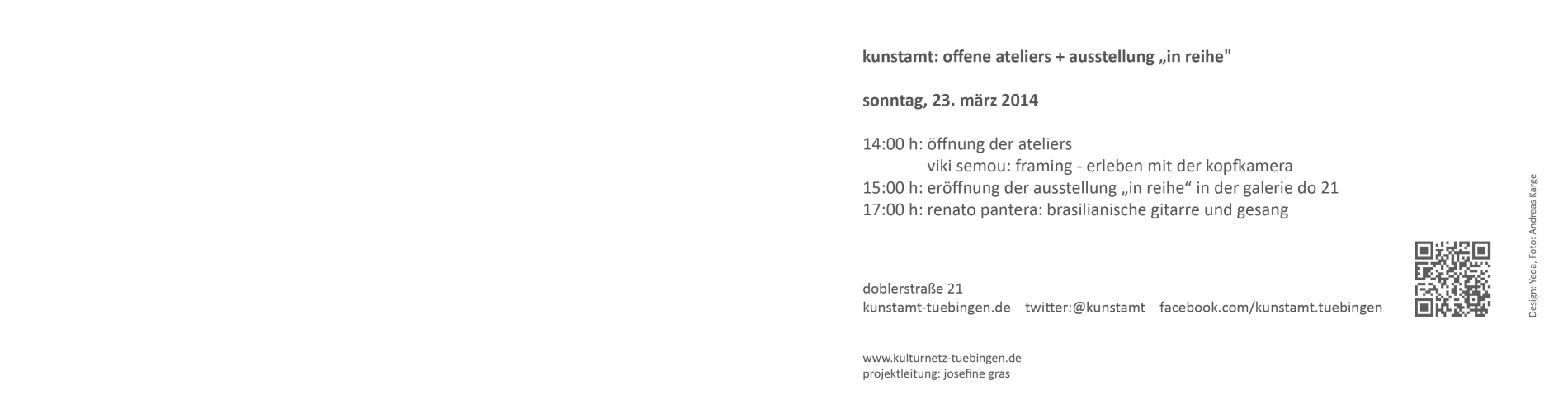 14 Uhr Öffnung der Ateliers Viki Semou: Framing - Erleben mit der Kopfkamera 15 Uhr Eröffnung der Ausstellung "In Reihe" in der Galerie do21 17 Uhr Renato Pantera: Brasilianische Gitarre und Gesang Es