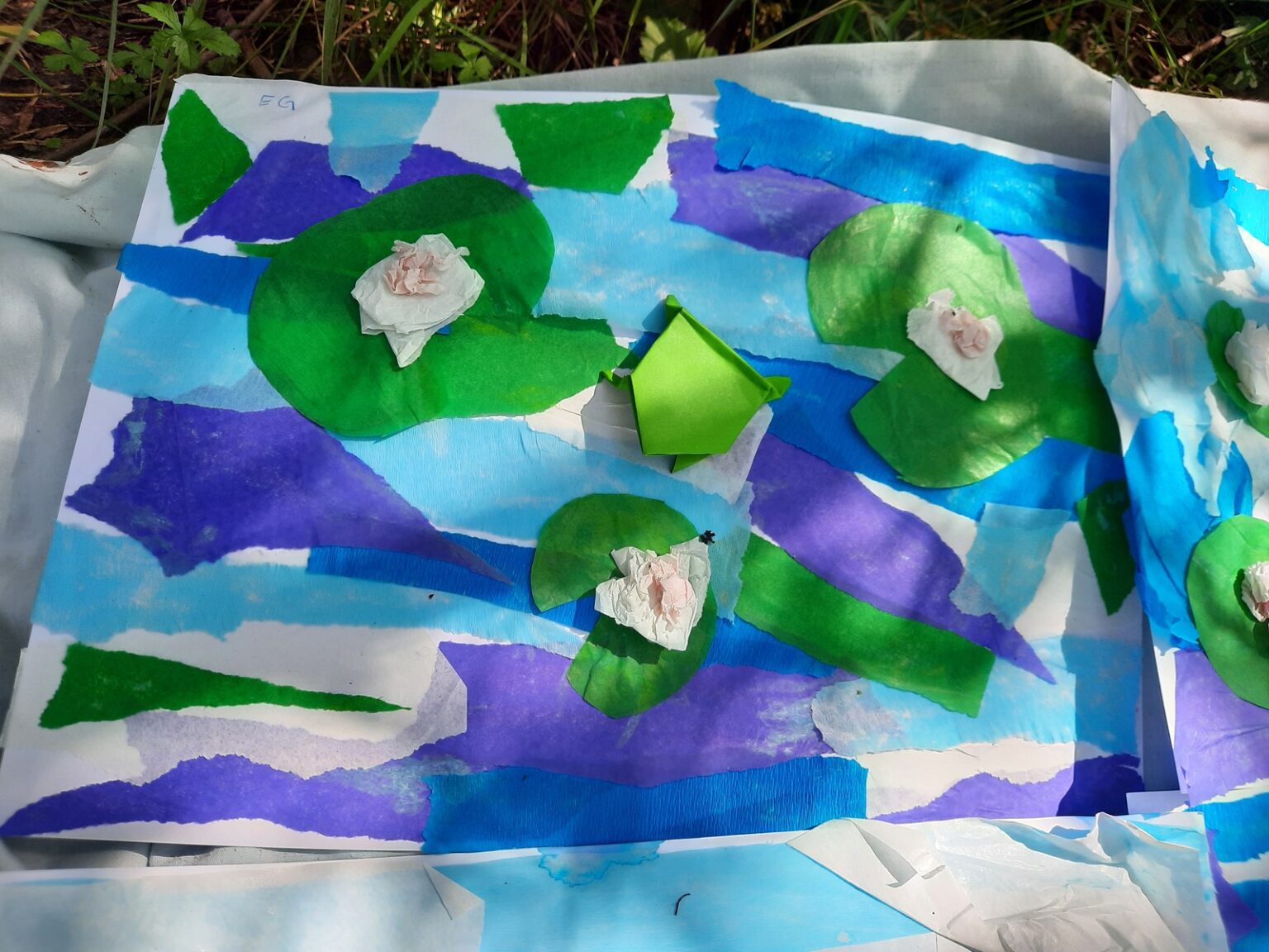 Am Sonntag gingen alle auf das Gütle der Freien Aktiven Schule und erstellten Collagen, die angelehnt an Claude Monets Seerosen aus Seidenpapier gestaltet wurden. Es sollten dreidimensionale Kunstwerke entstehen. Jedes Kind klebte auf einem festen Tonkarton seine Seerosen und alles was ihn oder sie in der umgebenden Natur inspirierte. Als alle Kinder ihre Kartons fertig geklebt hatten, legten sie alle zusammen auf eine Wiese und so entstand ein See voller unterschiedlicher Seerosen.